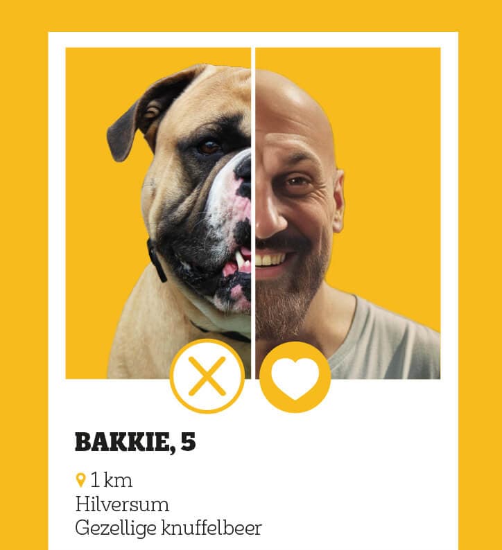 Uit onderzoek bleek dat veel asielhonden werden geselecteerd op uiterlijk in plaats van persoonlijkheid, wat leidde tot mismatches. Om het belang van een goede match te benadrukken, gebruikten we AI om menselijke alter-ego’s van asielhonden te creëren en plaatsten deze op dating-apps.